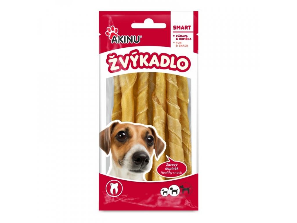 Akinu tyčinky bílé kroucené z kůže 12,5cm jsou dobrou žvýkací pochoutkou pro posílení žvýkacích svalů.