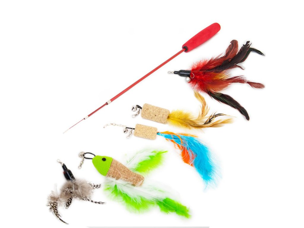Nová udice pro kočky 5 v 1 je kombinací teleskopické udice s pěti různými návnadami pro hraní.