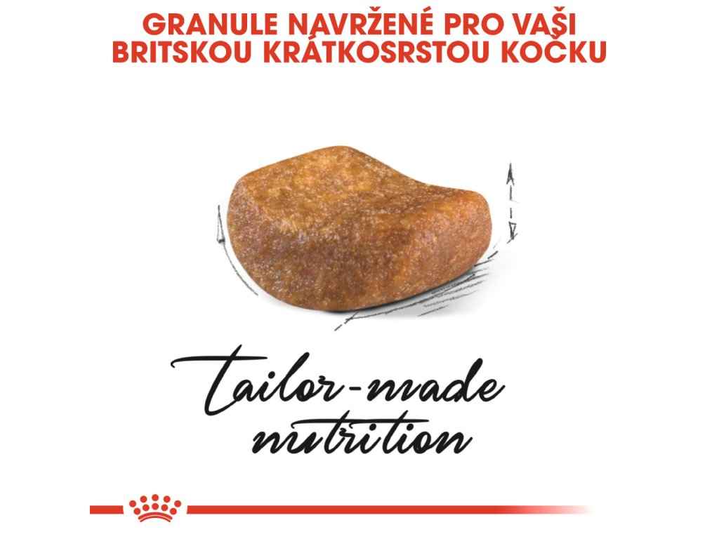 Granule krmiva ROYAL CANIN® British Shorthair Adult je speciálně tvarována a přizpůsobena široké čelisti britské krátkosrsté kočky. Velikost a zaoblení této granule ulehčuje uchopení a nutí ke žvýkání, které vede k dobré ústní hygieně.