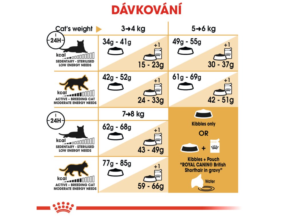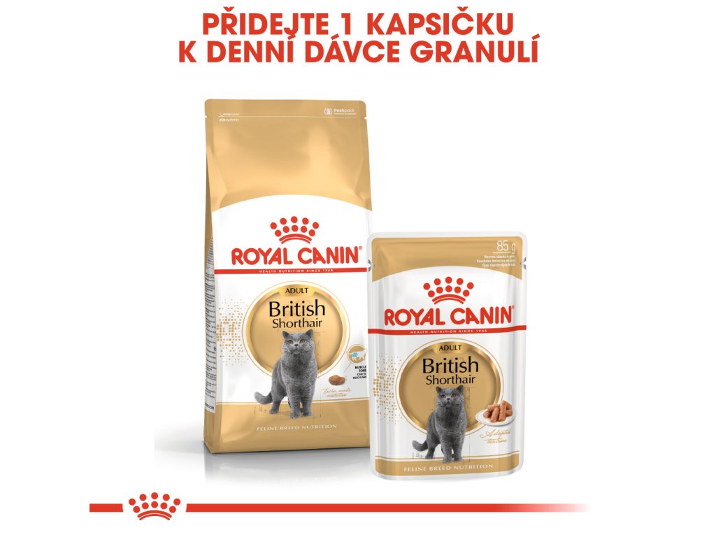 Aby mohlo uspokojit chutě co nejvíce koček, krmivo ROYAL CANIN® British Shorthair Adult je dostupné také ve vlhké formě jako kousky ve vynikající šťávě. Pokud přemýšlíte nad kombinovaným krmením, jednoduše se řiďte našimi pokyny, aby vaše kočka dostávala to správné množství suchého i vlhkého krmiva.