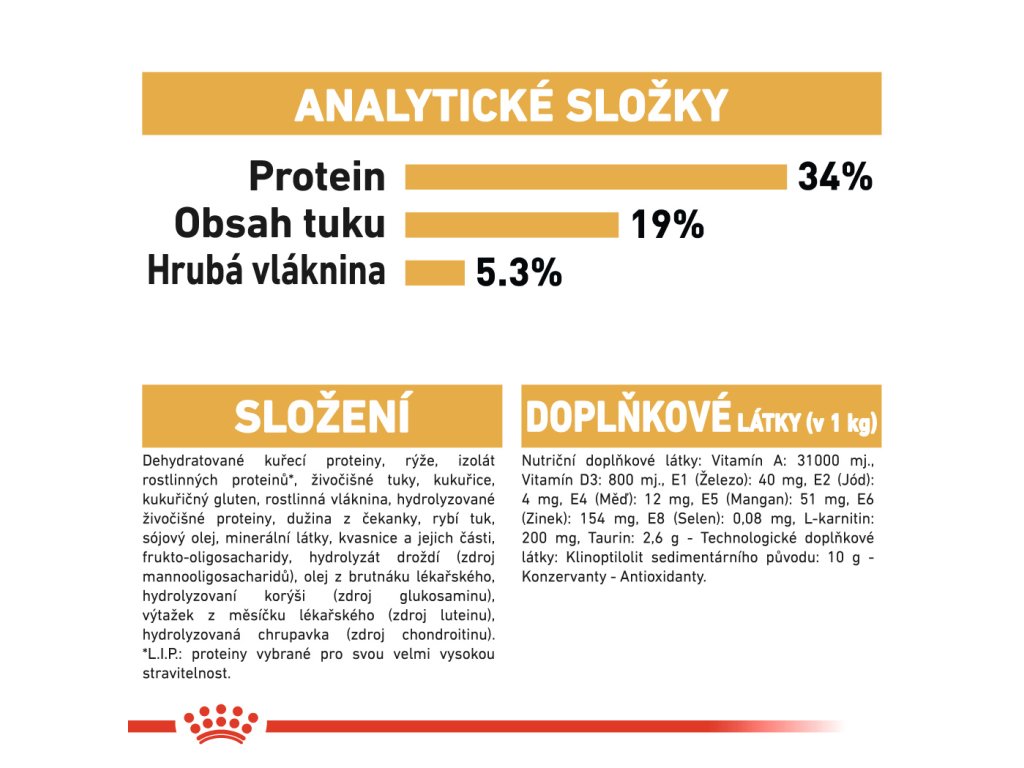Její kosti a klouby jsou kvůli mohutné stavbě zakulaceného těla vystaveny pravidelné nadměrné námaze. Díky zvýšenému obsahu taurinu, L-karnitinu, EPA-DHA a antioxidantů navíc krmivo maximálně posiluje funkci srdečního
