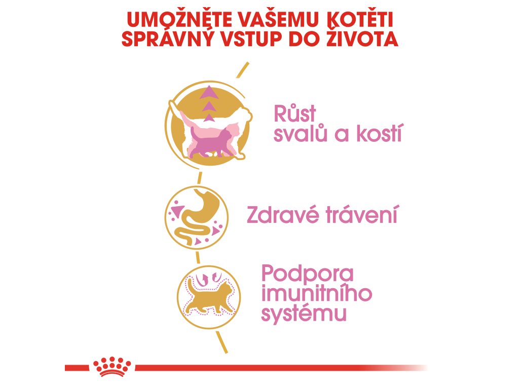 Období růstu vašeho kotěte britské krátkosrsté kočky je obdobím změn a nových objevů. Aby dospěla v silnou a svalnatou kočku typickou pro toto plemeno, potřebuje tu správnou výživu. Složení krmiva ROYAL CANIN® British Shorthair Kitten je vytvořeno tak, uspokojovalo veškeré nutriční potřeby vašeho kotěte. Začátek jeho života dláždí cestu zdravému vývoji v dospělého jedince. Až do 12. měsíce je trávicí trakt vašeho kotěte stále nezralý, proto je důležité zvolit stravu, která obsahuje velmi kvalitní bílkoviny. Z tohoto důvodu toto krmivo obsahuje vysoce stravitelné bílkoviny (označované anglickou zkratkou L.I.P.) a také prebiotika, která podporují rovnováhu střevní mikroflóry.