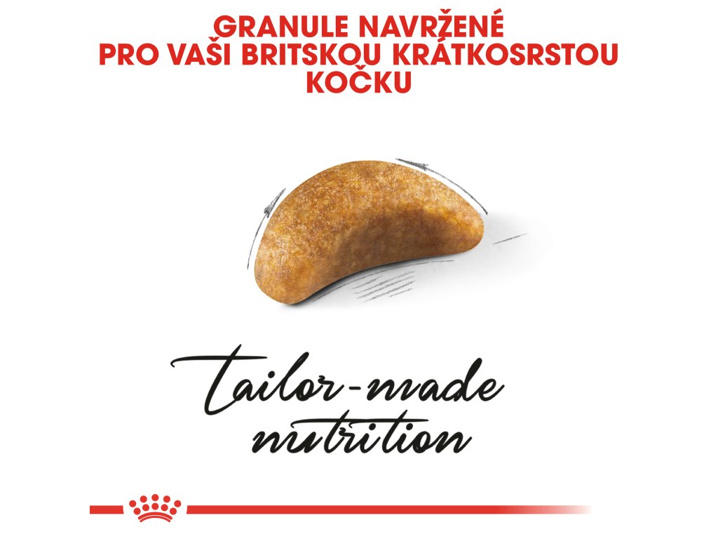 Granule krmiva ROYAL CANIN® British Shorthair Kitten má tvar půlměsíce a její velikost a textura je upravena tak, aby se vašemu kotěti dobře uchopovala. Také vybízí ke žvýkání, čímž podporuje silné zuby a celkovou ústní hygienu.