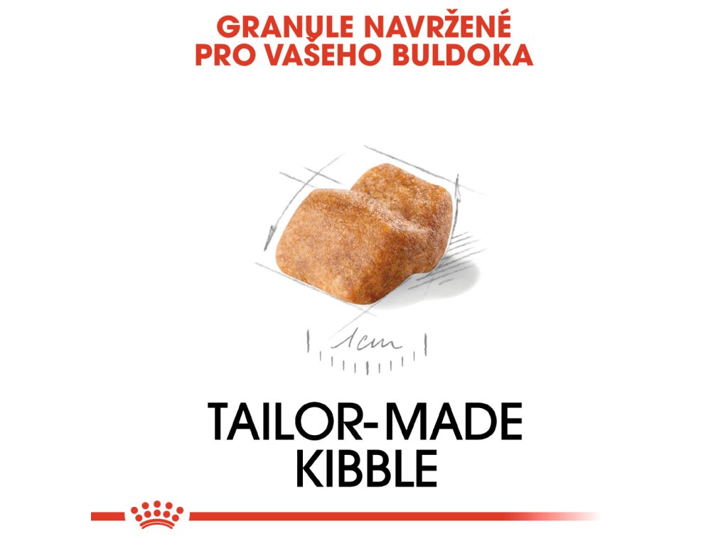 Granule krmiva ROYAL CANIN® Bulldog Puppy je navržena speciálně pro čelisti vašeho štěněte. Buldok má rovnou hlavu, která je skoro stejně široká jako dlouhá, horní čelist je kratší než čelist spodní, čumák míří vzhůru. Velikost a tvar této granule usnadňuje uchopování a nutí vaše štěně buldoka k pečlivému žvýkání.
