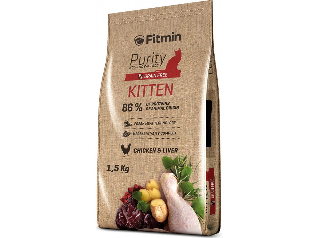 Kulinářský zážitek pro Vaše kotě. To je krmivo Fitmin cat Purity Kitten. Najdete v něm bohaté zastoupení kuřecího masa, čerstvých vepřových jater a rybího masa, bylinky na podporu vitality organismu, ovoce i zeleninu. Nejenže uspokojíte mlsné jazýčky Vašich koťat, ale zároveň jim poskytnete prvotřídní kvalitu Fitmin cat Purity Kitten je tzv. Grainfree krmivo, to znamená, že je bezlepkové a snižuje potencionální riziko výskytu alergických reakcí (např. na pšeničný lepek a kukuřičný gluten). Krmivo je svým unikátním složením ideální pro koťata a březí a kojící kočky. Krmivo obsahuje bylinnou směs, která má mnoho blahodárných účinků. Krmiva jsou vyráběna nejmodernějšími technologiemi, jsou vyvážená, obsahují vysoký podíl živočišných složek a mnoho dalších benefitů zejména komplex dentální péče, prebiotika, cheláty a další.