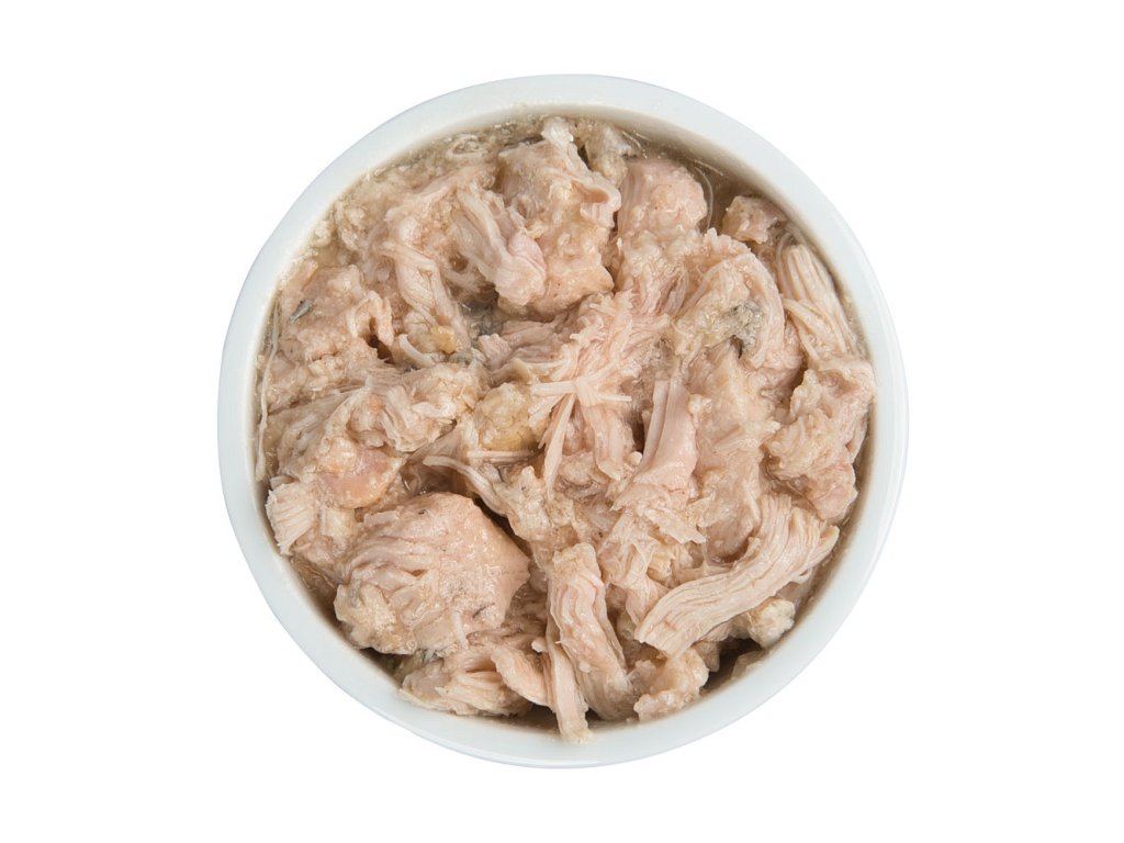 kuřecí prsa, losos. Konzerva může obsahovat kosti.