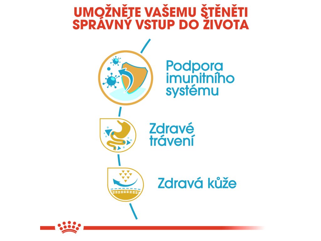 V tomto klíčovém období se imunitní systém vašeho štěněte vyvíjí postupně. Díky patentovanému komplexu antioxidantů, včetně vitamínu E, krmivo podporuje přirozenou obranyschopnost vašeho štěněte. Obsahuje velmi kvalitní bílkoviny (označované anglickou zkratkou L.I.P.) vybrané díky své vysoké stravitelnosti. Také obsahuje velmi prospěšná prebiotika. Kombinace těchto živin podporuje zdraví trávicího traktu a rovnováhu střevní mikroflóry, která vede ke kvalitní stolici. Exkluzivní složení také podporuje funkci kožní bariéry vašeho psa, čímž přispívá k celkovému zdraví jeho kůže. Když je kůže vašeho psa zdravá, je zdravá i jeho srst.