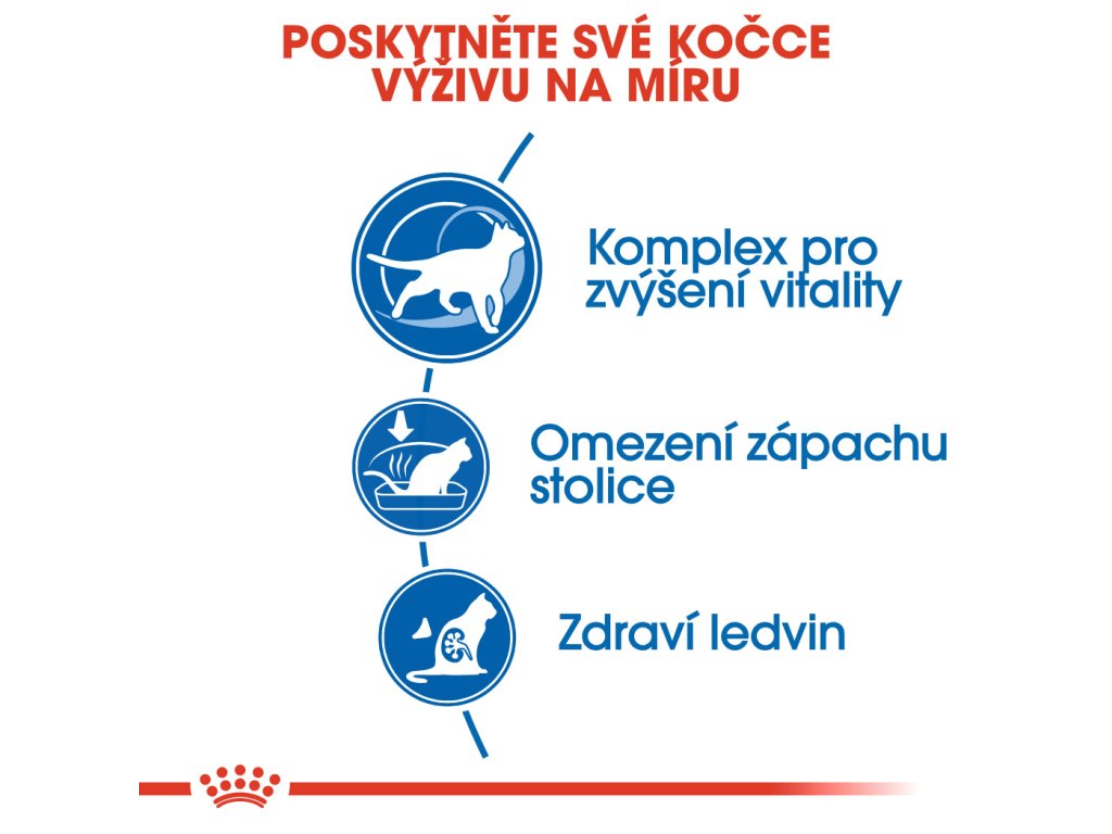 Do tohoto krmiva byly vybrány specifické bílkoviny díky svojí vysoké stravitelnosti (označované anglickou zkratkou L.I.P.). Vysoce stravitelné bílkoviny snižují nejen objem, ale také zápach stolice vaší kočky. To není skvělé jen pro vaši kočku, ale také pro vás! Navíc, díky správnému obsahu fosforu, krmivo ROYAL CANIN® Indoor 7+ podporuje ledviny a jejich zdravou funkci. Je důležité, aby vaše stárnoucí kočka dostala živiny, které podporují správnou funkci močového ústrojí. Krmivo je vytvořeno přesně pro tento úkol. Když bude mít vaše kočka zdravé močové cesty, bude první známky stárnutí snášet lépe.