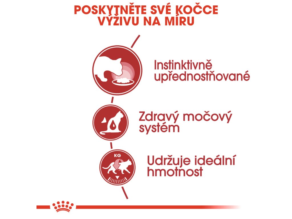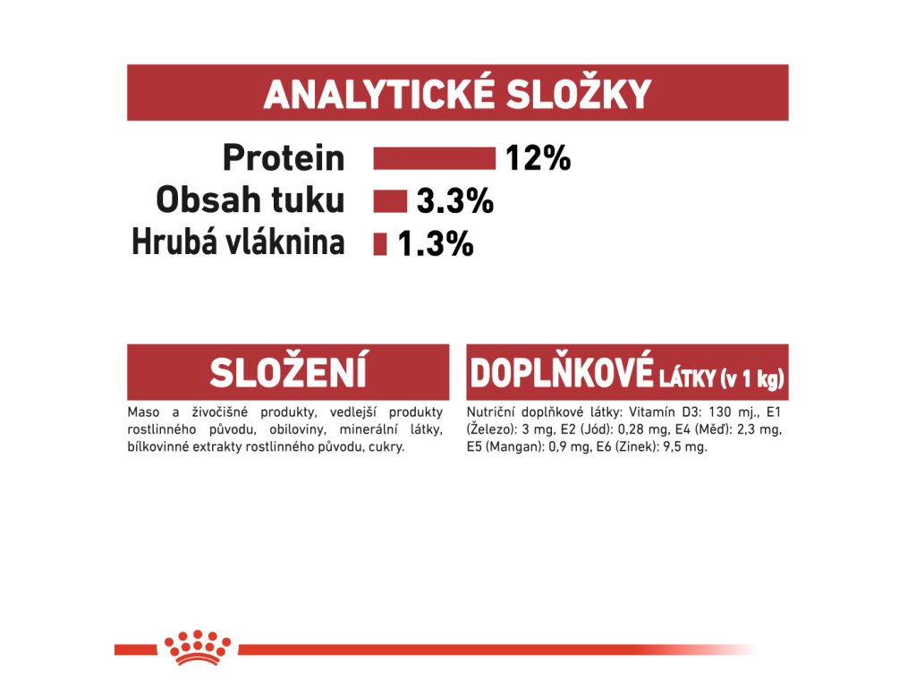 Složení živin obsahuje bílkoviny kvůli zdravé činnosti svalů a silným kostem, hrubou vlákninu, která podporuje činnost trávicího traktu, a hrubý popel nezbytný kvůli správnému množství minerálů jako je například draslík. Tato kombinace živin nebyla vytvořena jen proto, aby byla přirozeně chutná a výživná, ale také aby zachovávala ideální váhu a podporovala zdraví močových cest. Kapsička s paštikou pro kočky ROYAL CANIN® Instinctive Loaf obsahuje takové doporučené množství tuku, aby vaše kočka nepřijímala více energie než je nutné. Směs vlákniny a bílkovin navíc vyvolávají pocit sytosti.