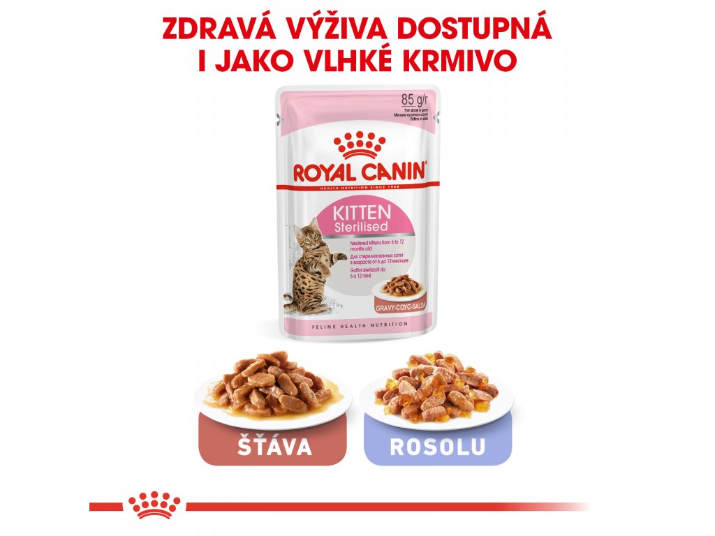 Aby mohlo uspokojit chutě co nejvíce koček, krmivo ROYAL CANIN® Kitten Sterilised je dostupné také ve vlhké formě jako kousky ve vynikající šťávě nebo šťavnatém želé. Pokud přemýšlíte nad kombinovaným krmením, jednoduše se řiďte našimi pokyny, aby vaše kočka dostávala to správné množství suchého i vlhkého krmiva.