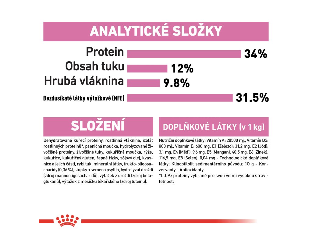 Toto krmivo je dobře tolerováno i citlivými žaludky, protože obsahuje vysoce stravitelné bílkoviny a prebiotika. Granule jsou také dostatečně měkké, aby se vašemu kotěti dobře žvýkaly. Navíc krmivo ROYAL CANIN® Kitten Sterilised pomáhá udržovat močové cesty vašeho kotěte zdravé. Nezapomínejte, že z tohoto důvodu musí mít vaše kočka vždy přístup k misce s čistou vodou. V těchto chutných a křupavých granulích se nachází drůbeží maso a rostlinná vláknina, které zaručují skvělou chutnost a optimální rovnováhu živin.