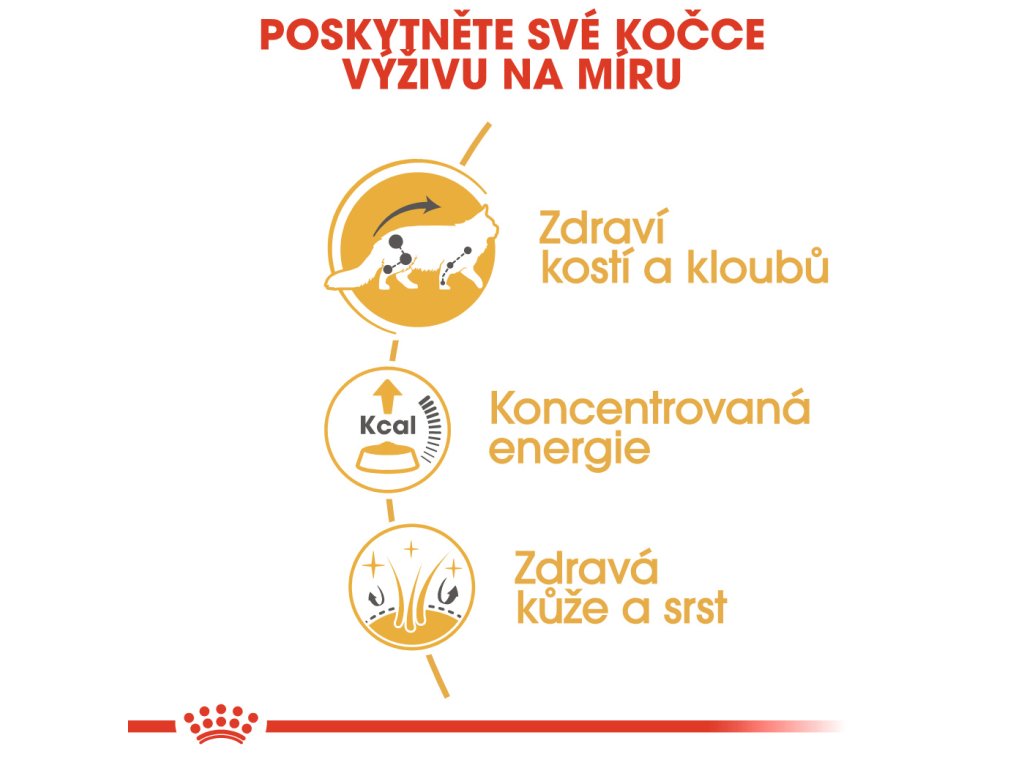 Kapsička také obsahuje vysokou koncentraci energie, aby vaše kočka měla sílu na všechna svoje dobrodružství každý den. Je obohaceno o taurin a omega-3 mastné kyseliny EPA a DHA, které podporují správnou funkci srdce. EPA a DHA také velmi prospívají kostem a kloubům. Kvůli velikosti mainské mývalí kočky se musí věnovat speciální pozornost stavu jejích kloubů a celkového zdraví.