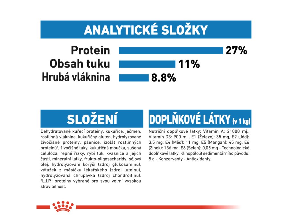 Krmivo ROYAL CANIN® Light Weight Care Maxi, je vhodné pro psy s hmotností od 26 do 44 kg a pomáhá udržovat správnou váhu a svalovou hmotu díky vysoce stravitelným bílkovinám. Bílkoviny jsou důležité, proto se používají pouze ty nejkvalitnější z nich a přizpůsobují se tak, aby vyhovovaly přesným potřebám vašeho psa. Dietní granule pro psy ROYAL CANIN® Light Weight Care Maxi obsahují optimální kombinaci rozpustné a nerozpustné vlákniny, aby byl zajištěn pravidelný, zdravý průchod střevy a váš pes se cítil zasycen. Složení je bohaté na omega 3 mastné kyseliny, jako jsou EPA a DHA, které pomáhají podporovat klouby vašeho psa. Navíc krmivo obsahuje nižší podíl tuků, aby si váš pes udržel ideální váhu.