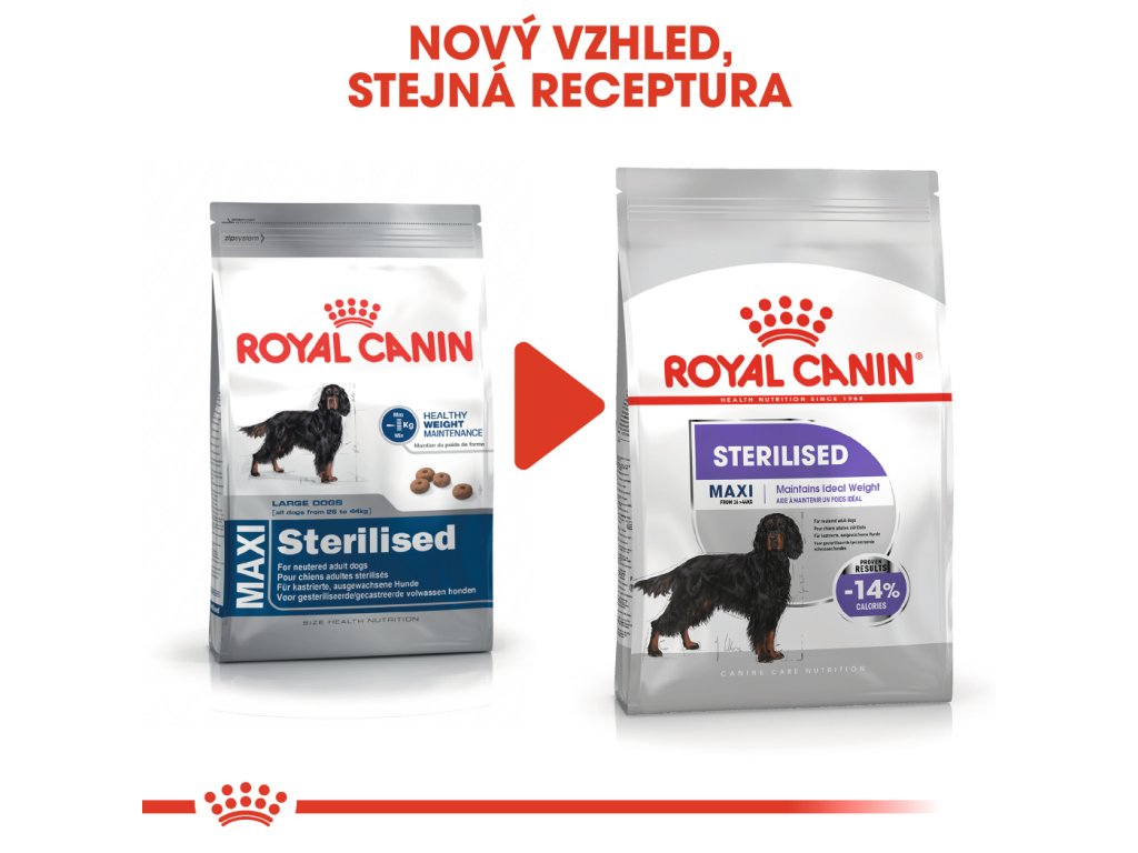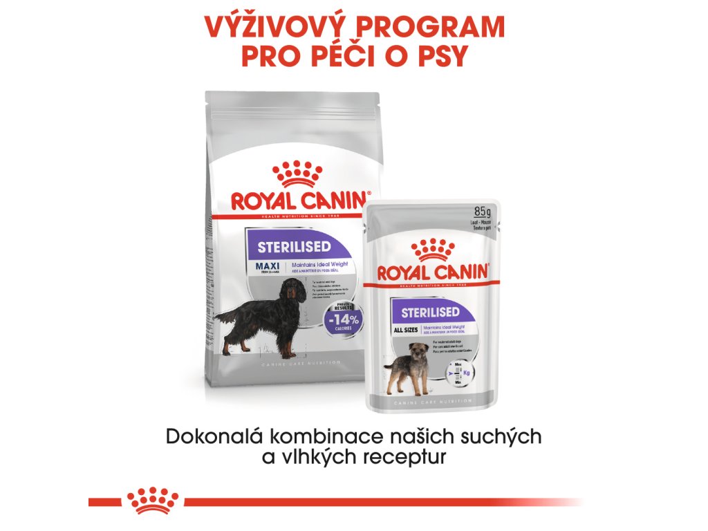 Náš program výživy Sterilised je dostupný jako křupavé granule a chutné paštiky v kapsičce. Obě jsou nutričně kompletní a dokonale se doplňují. Proč nevyzkoušet paštiku jako doplněk granulí? Při testování krmiva ROYAL CANIN® Sterilised Maxi bylo vědecky prokázáno, že obsahuje o 14 % méně kalorií než běžné krmivo pro dospělé psy. To znamená, že výsledky krmiva jsou prokázaným úspěchem.