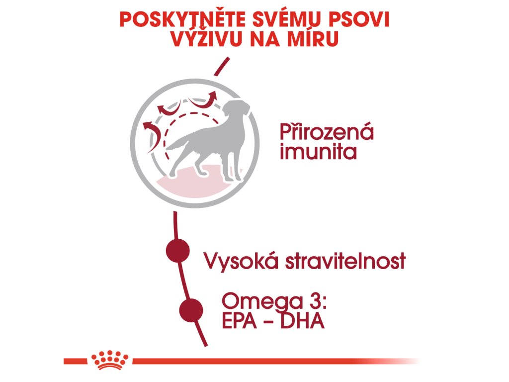 Krmivo ROYAL CANIN® Medium Adult je obohaceno o omega-3 mastné kyseliny EPA a DHA, které udržují kůži a srst vašeho psa zdravé. Specifická rovnováha vitamínů a minerálů v tomto krmivu vašemu psovi poskytuje skvělou podporu zdraví. Energetický obsah v tomto krmivu je nastaven tak, aby odpovídal specifickým potřebám středních psů a ti si mohli zachovat aktivní styl života.