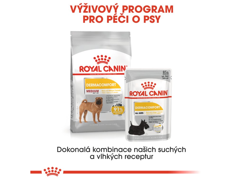 Program výživy Dermacomfort je dostupný jako křupavé granule a chutné paštiky v kapsičce. Obě jsou nutričně kompletní a dokonale se doplňují. Proč nevyzkoušet paštiku jako doplněk granulí? Po 2 měsících užívání tohoto krmiva si 91 % majitelů psů všimlo zlepšení. To znamená, že výsledky krmiva ROYAL CANIN® Dermacomfort Medium jsou prokázaným úspěchem.