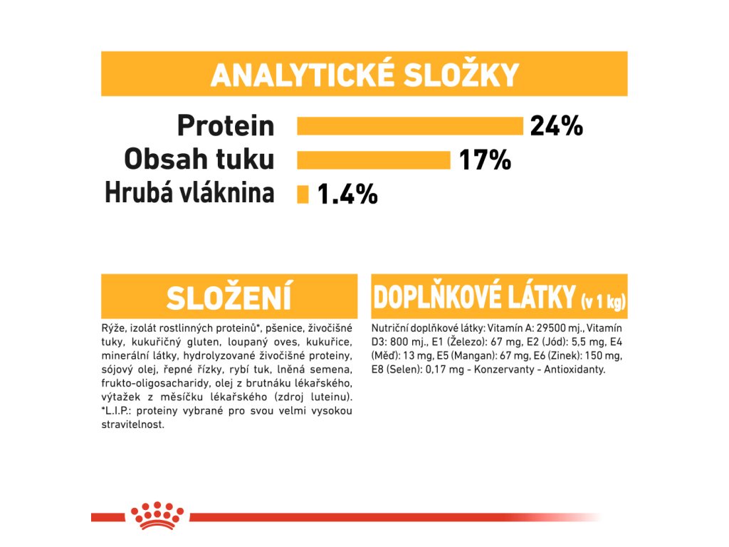 Granule ROYAL CANIN® Dermacomfort Medium, vhodné pro psy s hmotností od 11 do 25 kg, obsahuje pečlivě navržené granule, které dokonale vyhovují zubům vašeho psa. Toto krmivo je obohaceno o mastné kyseliny omega 3 a omega 6, které se vyznačují protizánětlivými vlastnostmi. Mastné kyseliny z ryb a rostlinných olejů pomáhají zklidnit a chránit pokožku, která je díky tomu méně citlivá na dráždivé látky v prostředí. Mimořádně chutné krmivo je bohaté na pečlivě vybrané bílkoviny s nízkým obsahem alergenů. Royal Canin ví, jak jsou bílkoviny důležité – proto používá pouze ty nejkvalitnější z nich a jejich typ přizpůsobuje tak, aby vyhovovaly specifickým potřebám vašeho psa.