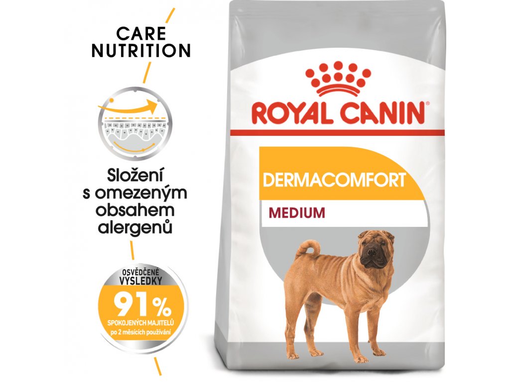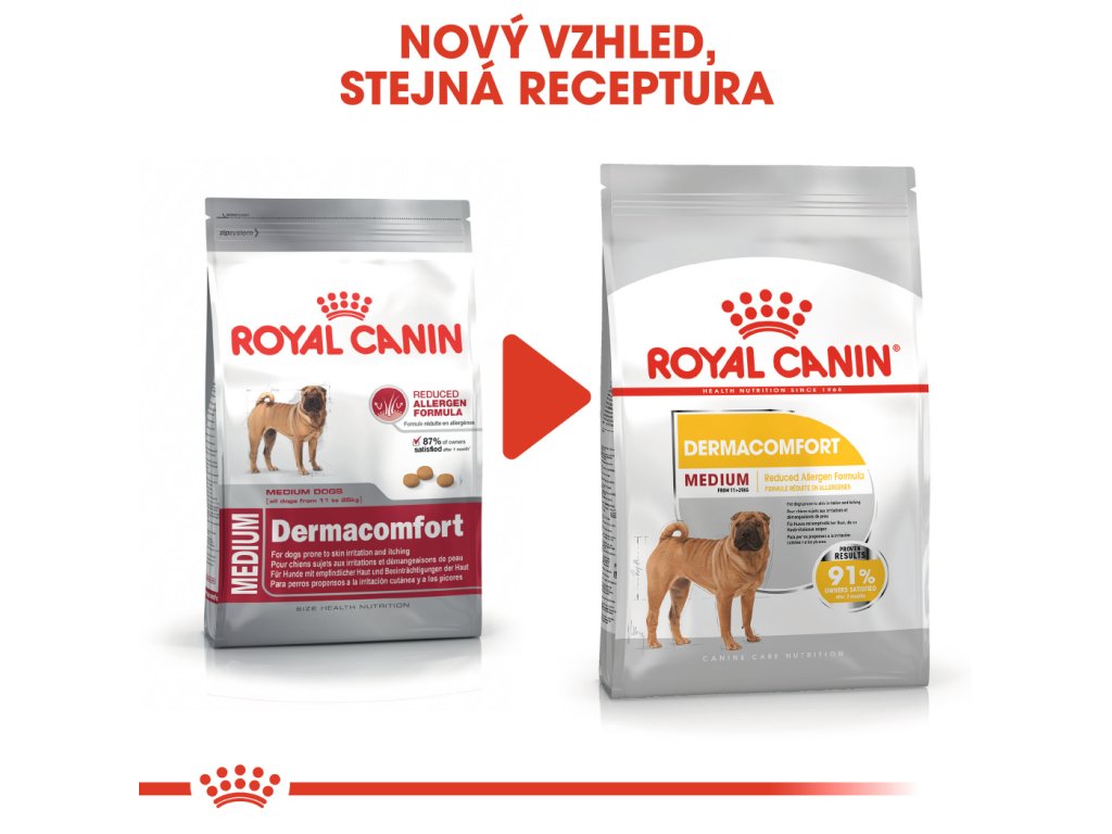 Program výživy Dermacomfort je dostupný jako křupavé granule a chutné paštiky v kapsičce. Obě jsou nutričně kompletní a dokonale se doplňují. Proč nevyzkoušet paštiku jako doplněk granulí? Po 2 měsících užívání tohoto krmiva si 91 % majitelů psů všimlo zlepšení. To znamená, že výsledky krmiva ROYAL CANIN® Dermacomfort Medium jsou prokázaným úspěchem.