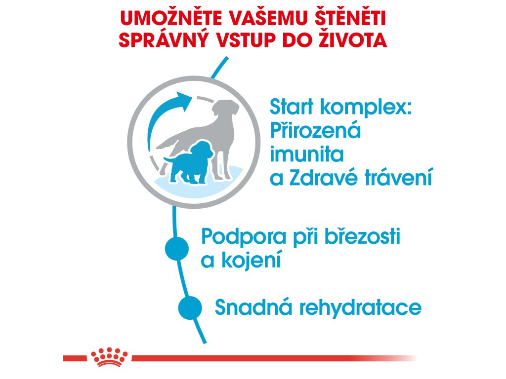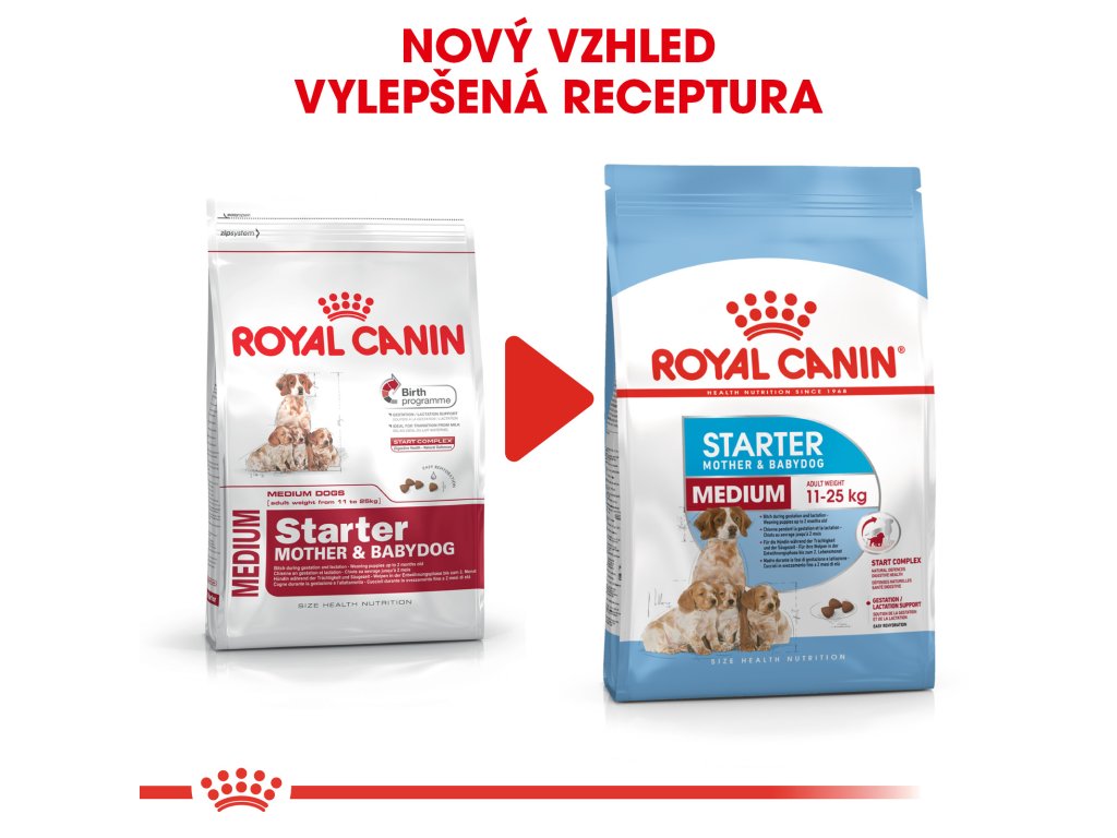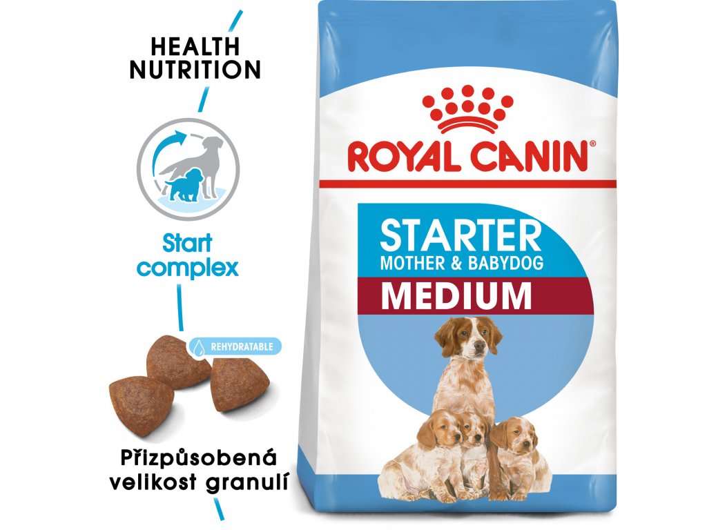 Royal Canin Starter Mother&Babydog Medium je kompletní super prémiové krmivo pro štěňata (do 2 měsíců věku) a březí/kojící feny středních plemen (11 - 25 kg váhy v dospělosti).