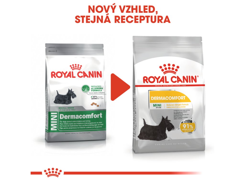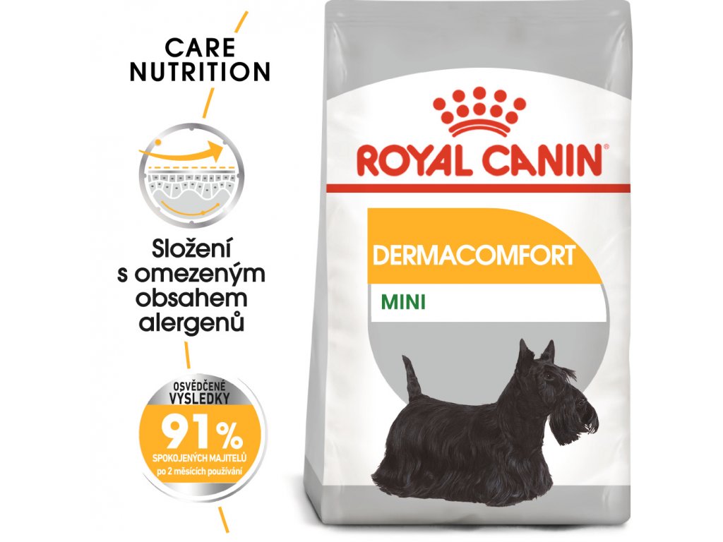 Krmivo ROYAL CANIN® Dermacomfort Mini se sníženým obsahem alergenů je pečlivě připravováno za použití speciálně vybrané řady bílkovin. Tato speciálně upravená výživa pomáhá udržovat pokožku vašeho psa v co nejlepším stavu. Také pomáhá udržovat srst hustou a zdravou. Granule pro psy ROYAL CANIN® Dermacomfort Mini, vhodné pro psy do 10 kg, obsahují pečlivě navržené granule, které dokonale vyhovují zubům vašeho psa. Obsahuje mastné kyseliny omega 3 a omega 6, včetně kyselin GLA, EPA a DHA, které podporují a vyživují kůži, jež je díky tomu méně citlivá na dráždivé látky v okolním prostředí.