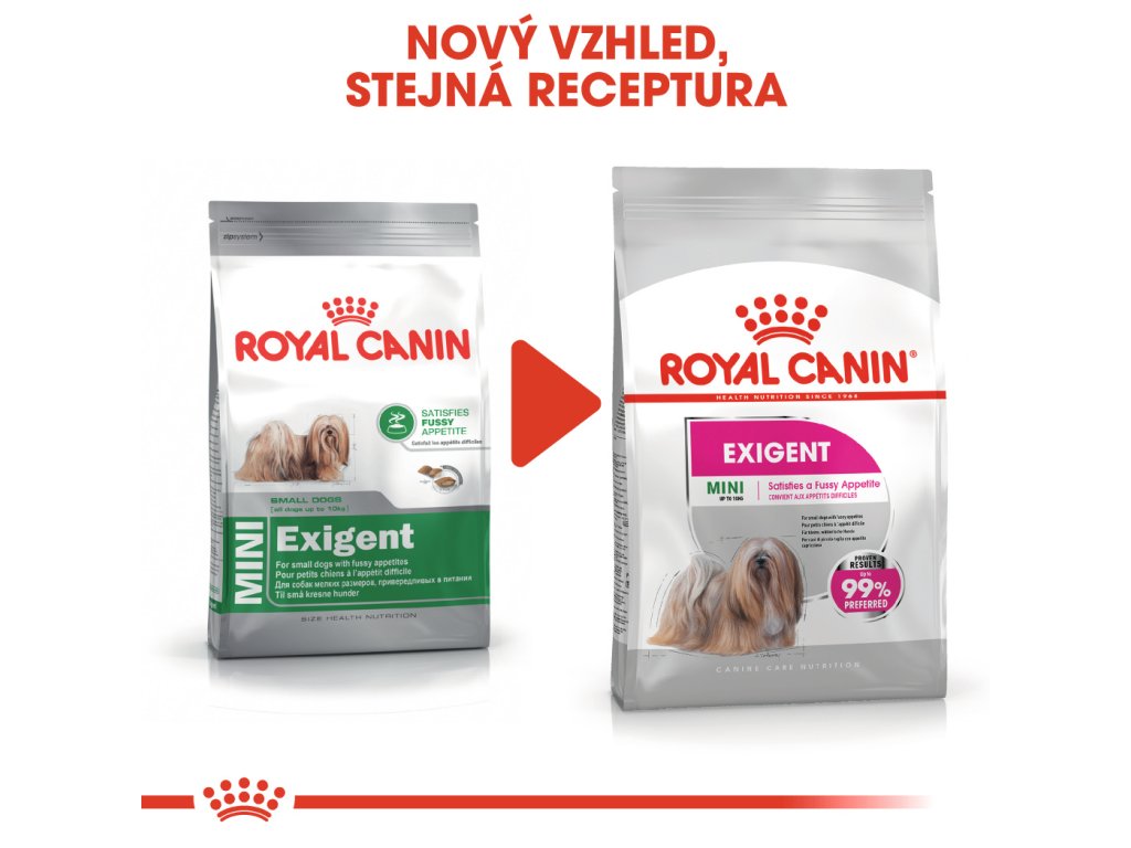 Program výživy Exigent je dostupný jako křupavé granule a chutné paštiky v kapsičce. Obě jsou nutričně kompletní a dokonale se doplňují. Proč nevyzkoušet paštiku jako doplněk granulí? Výsledky krmiva ROYAL CANIN® Exigent Mini jsou prokázaným úspěchem. Při vědeckém testování v pet centru Royal Canin upřednostňovalo toto krmivo až 99 % psů.