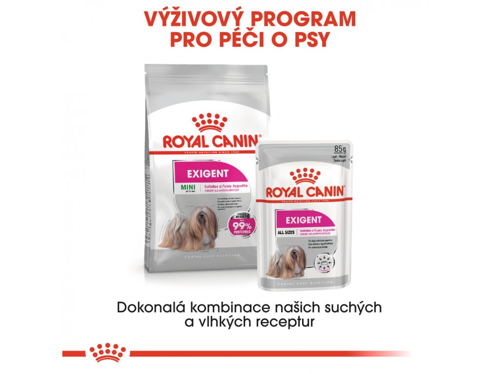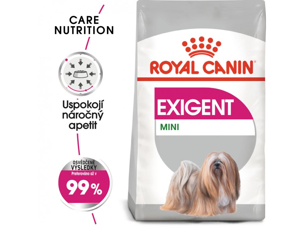 Při jídle pes posuzuje vůni, velikosti sousta a konzistenci pokrmu. Chcete-li, aby váš pes jedl zdravě – tedy nejen pamlsky, po kterých touží, když odmítá běžné jídlo – sáhněte po zdravém a nutričně kompletním krmivu, které je neodolatelné i pro nejvybíravější psy. Krmivo ROYAL CANIN® Exigent Mini je vhodné pro mlsné psy, kteří váží do 10 kg. Tyto granule pro psy obsahují veškerou výživu, kterou váš pes potřebuje ke zdravému životu. Granule mají tvar polštářků, křupavou konzistenci a jsou plněny aromatickou paštikou plnou živin. Křupavé granule jsou zvenku chutné a mastné, zatímco náplň z paštiky je bohatá a lahodná. Veškerá krmiva Royal Canin jsou nutričně kompletní a obsahují 100 % kvalitních bílkovin, tuků, vlákniny, vitamínů a minerálů, které váš pes potřebuje pro celoživotní tělesnou a duševní pohodu.