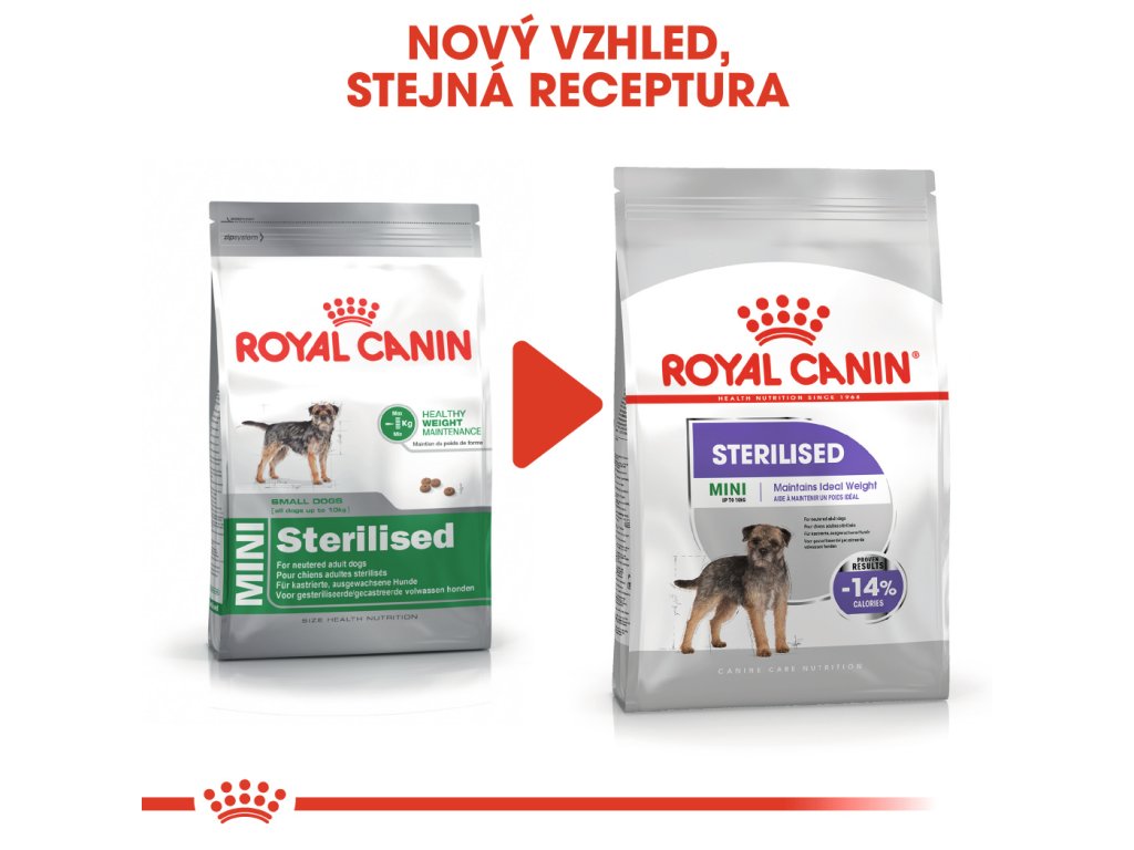 Program výživy Sterilised je dostupný jako křupavé granule a chutné paštiky v kapsičce. Obě jsou nutričně kompletní a dokonale se doplňují. Proč nevyzkoušet paštiku jako doplněk granulí? Při testování krmiva ROYAL CANIN® Sterilised Mini bylo vědecky prokázáno, že obsahuje o 14 % méně kalorií než běžné krmivo pro dospělé psy. To znamená, že výsledky krmiva jsou prokázaným úspěchem.