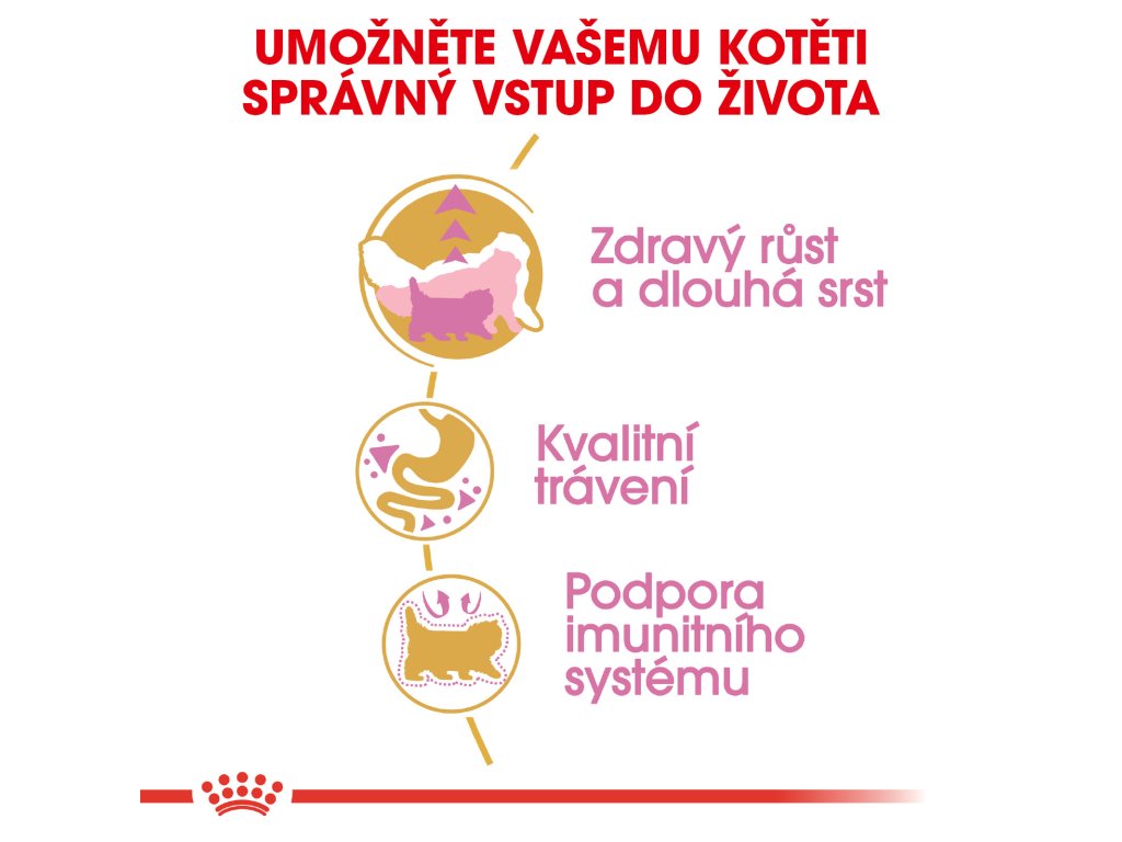 Když vaše perské kotě roste, začíná mu růst i typická dlouhá, hustá a hedvábná srst. Taková srst potřebuje výživu hned od začátku. Krmivo ROYAL CANIN® Persian Kitten obsahuje upravený obsah bílkovin a vyvážený obsah vitamínů a minerálů, který přispívá nejen k celkovému zdraví vašeho kotěte, ale i ke krásné srsti a zdravé kůži. Chovatelé si všimli toho, že trávicí systém perských koťat se vyvíjí postupně a nějakou dobu zůstává nezralý. Proto krmivo obsahuje vysoce stravitelné bílkoviny té nejvyšší kvality. Obsahuje také upravený obsah vlákniny (včetně psyllia) a prebiotik, který podporuje rovnováhu střevní mikroflóry. Navíc toto speciální krmivo obsahuje patentovaný komplex antioxidantů, včetně vitamínu E, který podporuje přirozenou obranyschopnost vašeho kotěte.