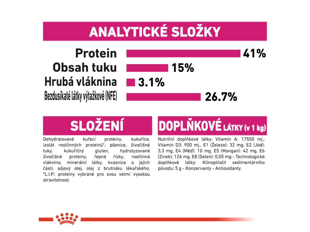 Složení krmiva ROYAL CANIN® Protein Exigent je vytvořeno tak, aby uspokojovalo veškeré nutriční potřeby vybíravých dospělých koček. Některé vybíravé kočky preferují krmivo s vysokým obsahem bílkovin. Krmivo obsahuje ideální poměr bílkovin, sacharidů a tuků, který uspokojuje chutě koček s touto preferencí. Obsahuje také vysoce stravitelné bílkoviny (označované anglickou zkratkou L.I.P.). Aby ještě více podporovalo zdraví vaší kočky, krmivo ROYAL CANIN® Protein Exigent obsahuje speciálně upravené množství energie, díky kterému si udržuje svou ideální váhu.